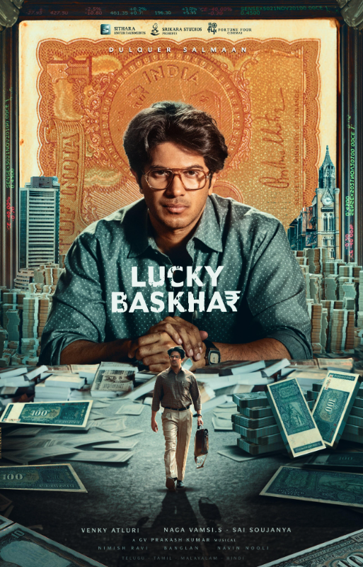LUCKY BHASHKER :- As assistant general manager, Baskhar learns that businessman Harsha Mehra uses the money to manipulate the share market and paid off the bank to keep quiet. He makes a deal with Katari Bank’s broker Suraj to clear the receipts in exchange for a cut and stock tips. Using the stock gains and an unscrupulous hawala agent, he is able to legitimise his income, first through a winning lottery ticket and afterwards by setting up Sumathi’s home foods business. This scheme enriches Baskhar, making his family rich but also turning him into an arrogant, cold man, distancing him from Sumathi, who eventually destroys the business in anger. Prahalad breaks his silence and reveals he knew of the scheme, warning him of the perils of greed. Sumathi learns the business is a front by overhearing him, making her shum him completely; Baskhar changes and wins her back after he becomes more humble. He further rethinks his life after bailing out Samba, who was caught and arrested, losing all his earnings.